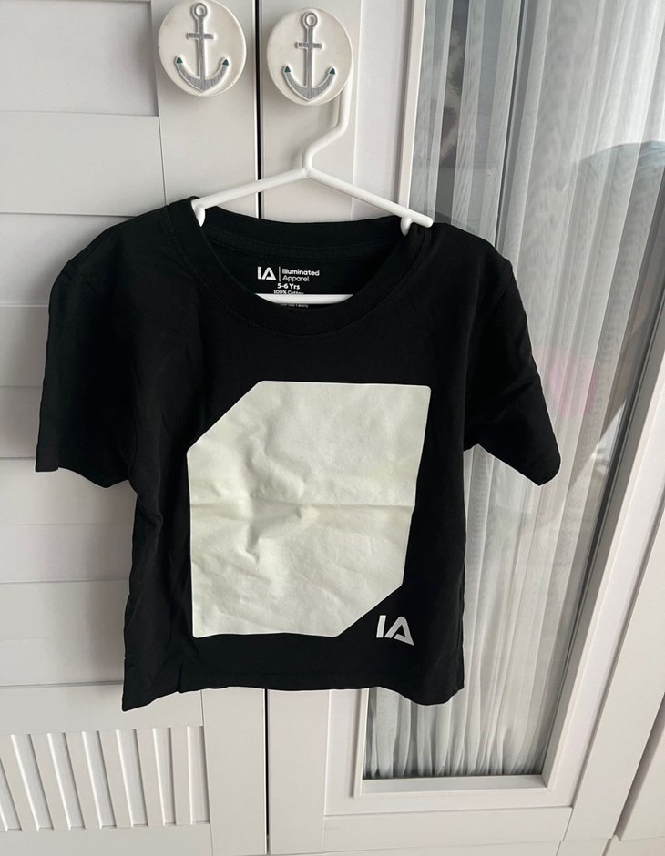 Çocuklar için siyah kısa kollu içlik, önünde büyük beyaz baskı ve küçük IA logosu bulunur. Özel kalemi var. Kalem ile beyaz bölüme çizğm yapılıyor ama ışıkla. Rahat ve günlük kullanım için uygun. İngiltere’den.