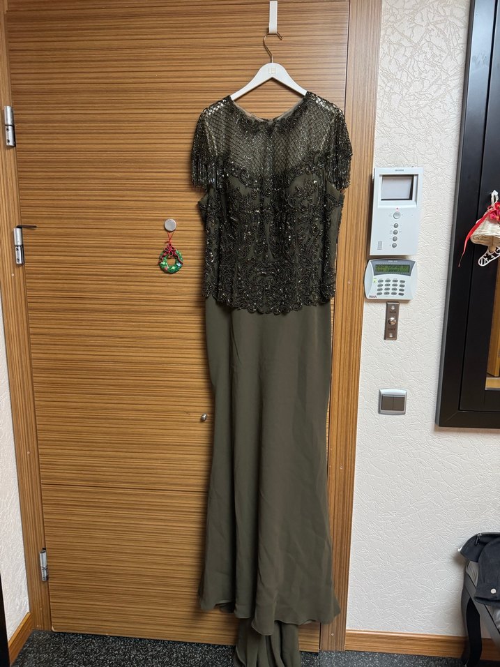 Haki yeşili renkli, nakışlı ve salaş kesim uzun kadın abiye elbise. Kolsuz, yuvarlak yaka ve drapeli detaylara sahip, vintage bohem tarzında düğünler için uygun. ILMIO ANKARA MAGAZASINDAN ALINDI, YALNIZCA 1 KEZ DÜĞÜNDE GİYİLDİ. ÖLÇÜLERİ FOTOGRAFLADIM