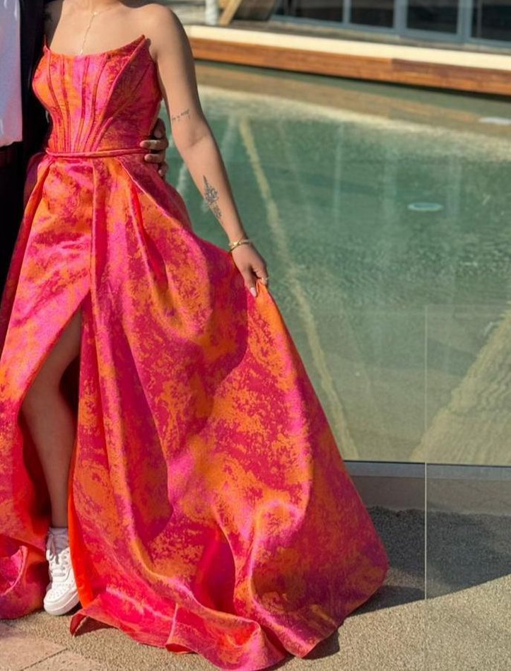 Pembe tie-dye desenli, straplez ve drapeli uzun abiye elbise,. İlmio ankara mağazasından alındı tertemiz sadece birkez giyildi. Tadilat yapılmadı manken 1.60 boy kilo 55