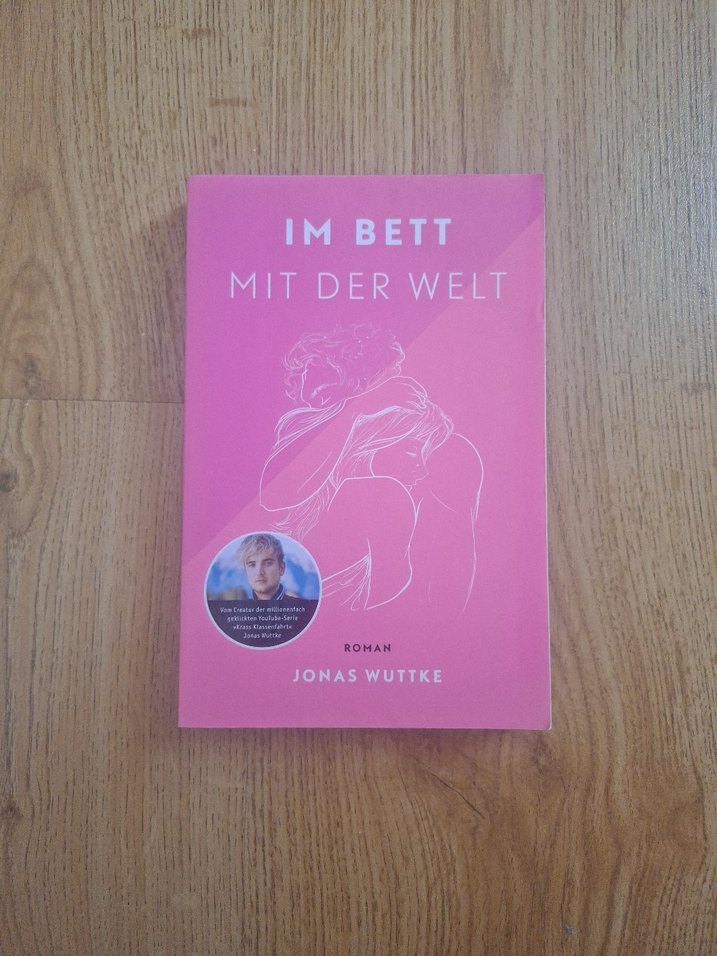 Jonas Wuttke'nin "Im Bett Mit Der Welt" adlı romanı, sarılan bir çiftin çizimiyle pembe kapaklıdır. İnsan ilişkilerini konu alır.