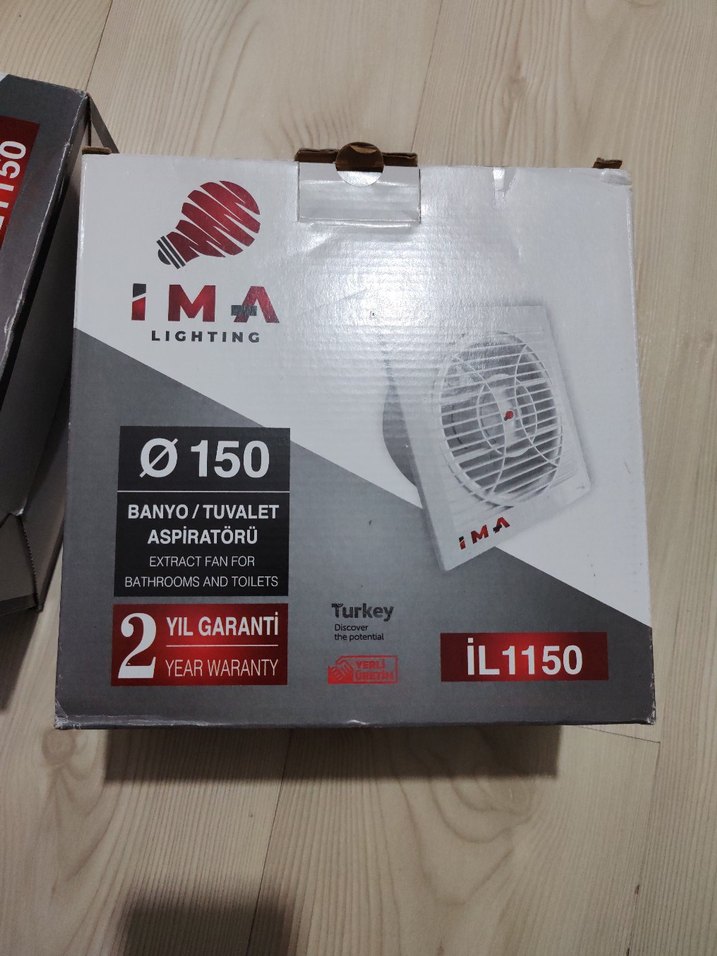 IMA beyaz banyo ve tuvalet aspiratörü, 150 mm çapında ve 2 yıl garanti ile sunulmaktadır.