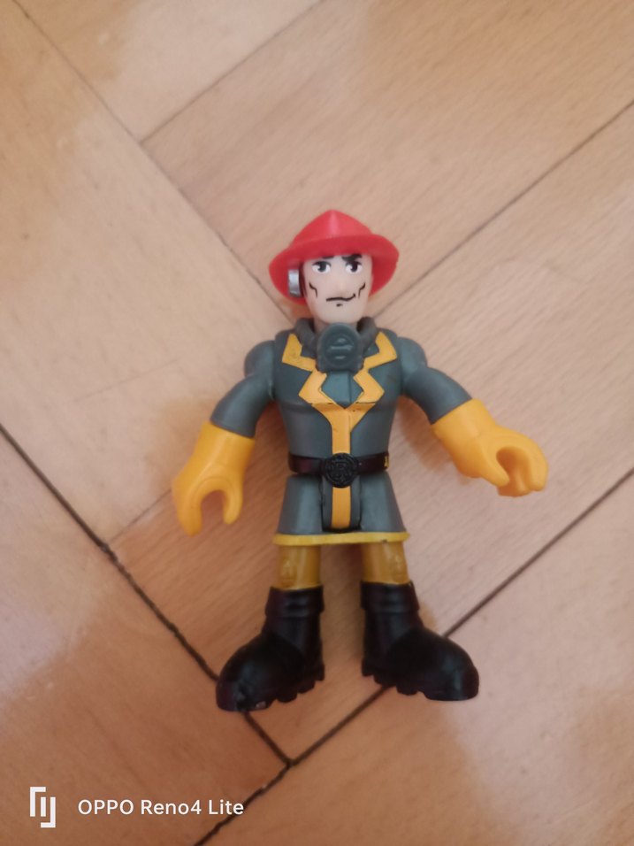 Gri, sarı ve kırmızı detaylara sahip renkli aksiyon figürü, kırmızı şapkalı ve büyük sarı eldivenli karakter. ♂️