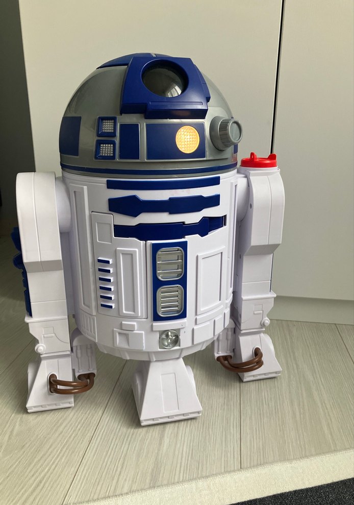 Beyaz ve mavi renkli R2-D2 aksiyon figürü, detaylı tasarıma ve ışıklı özelliklere sahiptir. Üç ayak üzerinde durmaktadır. Sesli ışıklıdır tertemiz