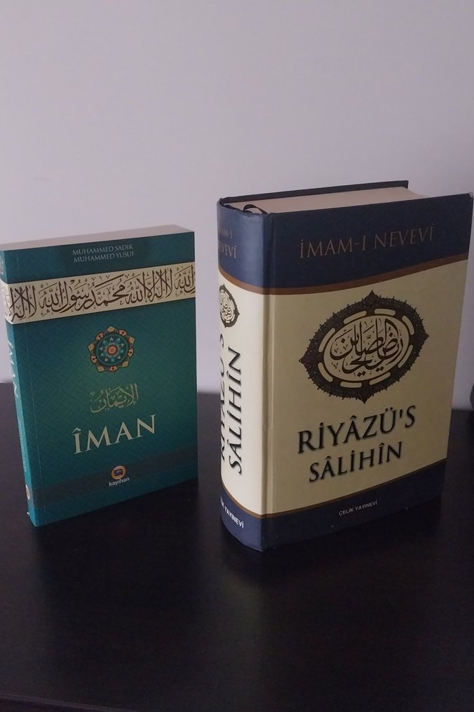 İmam Nevevi'nin Riyazü's Salihin kitabı yanında İman isimli akaid kitabı HEDİYE Eser temelde temiz yalnızca kapak ve sayfa arasında bir defosu var fotoğraflarda gösterildi