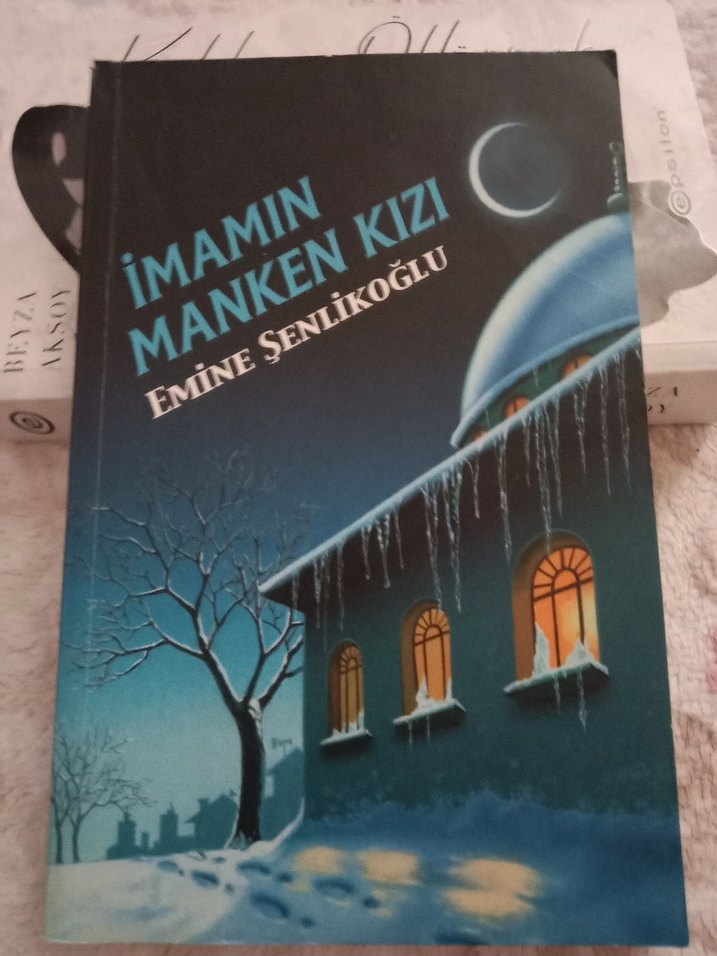 Emine Şenlikoğlu'nun "İmamın Manken Kızı" romanı, karla kaplı, ay ışığı altında bir ev ve çıplak ağaç tasviriyle gizemli bir atmosfer sunuyor. ❄️