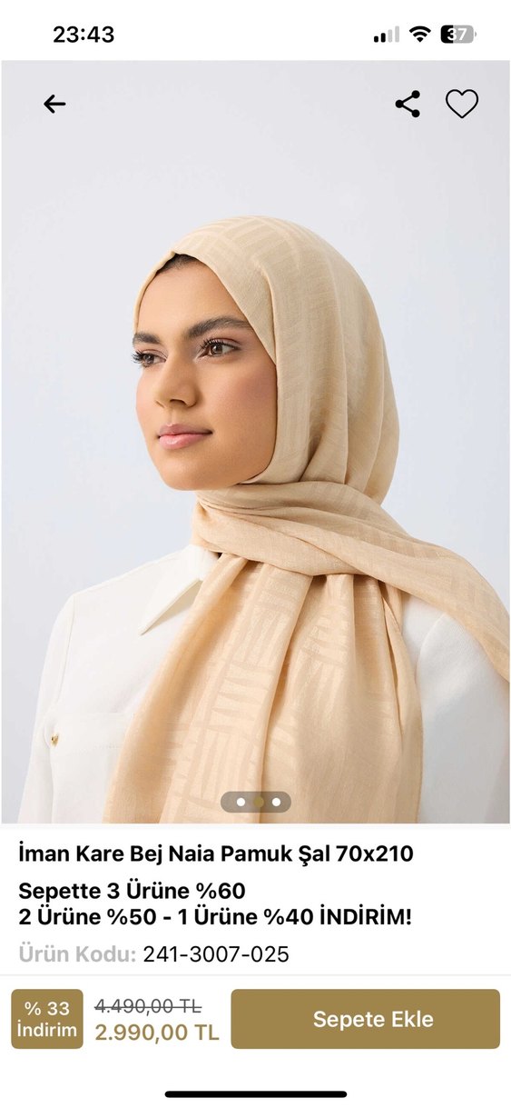 Bej renkte, 70x210 cm ölçülerinde, yumuşak ve ipeksi pamuk kumaştan drapeli kadın şalı. Minimalist ve sade tarz için uygundur. Hiç kullanmadım rengi tenime olmadığı için satıyorum orjinal sitesinden alındı