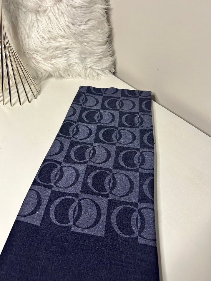 Kadınlar için mavi ve gri desenli, elastik kumaştan yapılmış şal. Rahat ve mütevazı bir tarz sunar, çağdaş ve sıcak bir görünüme uygundur.