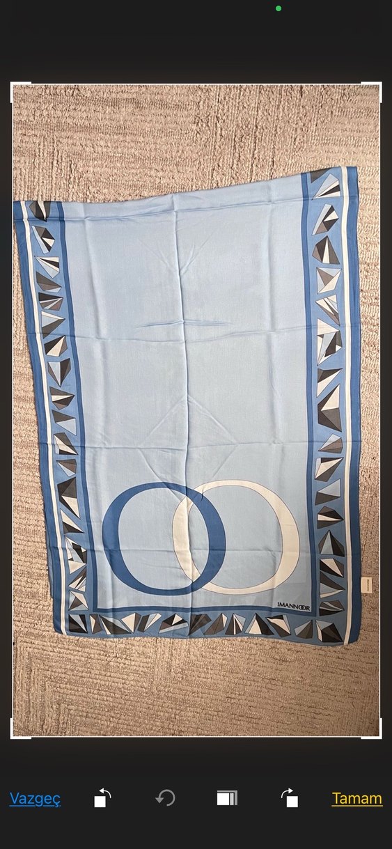 Mavi ve gri renklerde, ipek dokulu, drapeli vintage geometrik desenlere sahip kadın şalı. Bohem tarz için uygundur.
