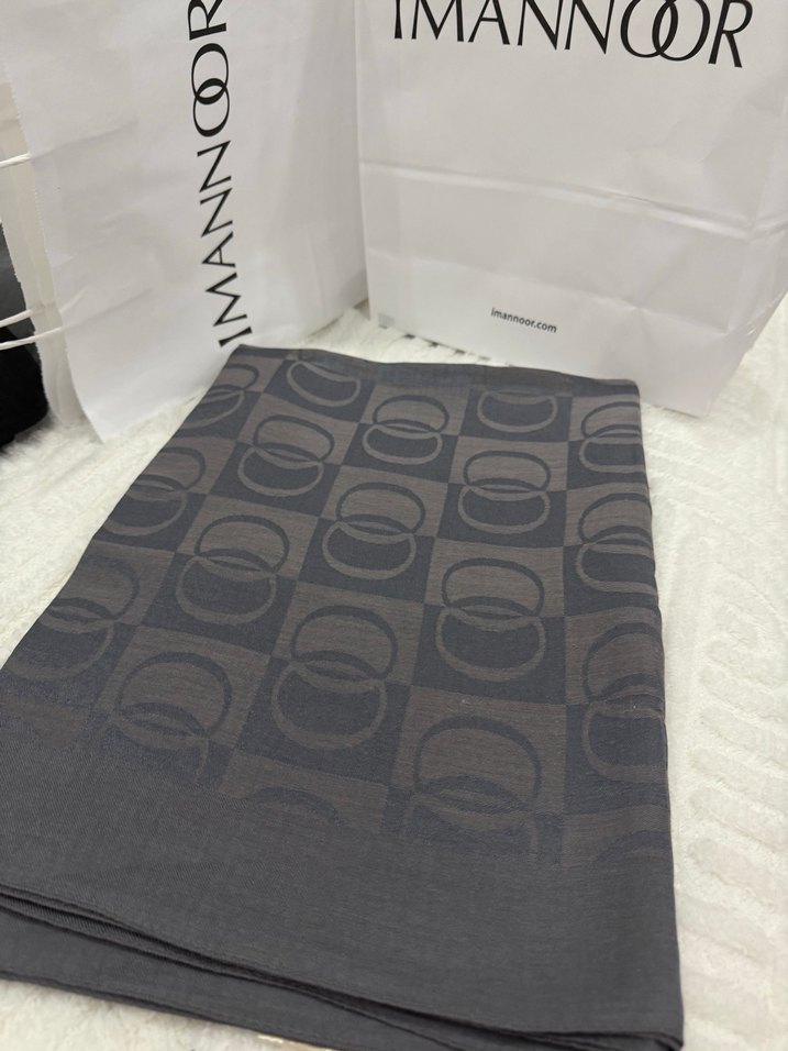 Gri renkte, dairesel desenlerle süslenmiş çağdaş kareli drapeli şal. Yumuşak sentetik kumaştan yapılmış, rahat ve şık bir görünüm sunar. Marka adı IMANNOR tasarıma dahil edilmiştir.