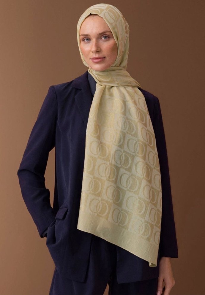 Kadınlar için dökümlü tasarıma sahip, hafif camel renkli ve saten dokulu şal. Mütevazı ve minimalist tarz için uygundur.