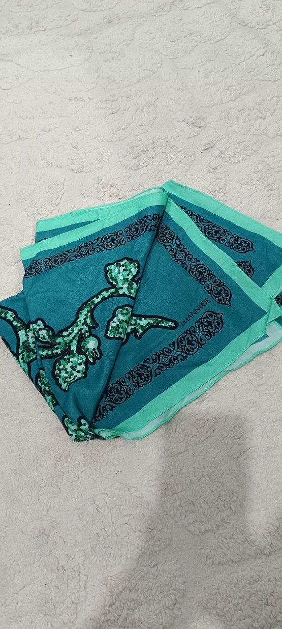 Bohem desenlerle süslenmiş koyu turkuaz renkli, drapeli kadın şalı. Yumuşak tekstil kumaştan yapılmıştır. İmanoor orjinal iki kere kullanıldı