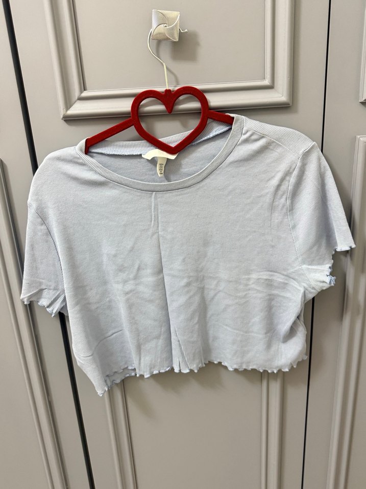 Pamuklu mavi crop tişört, kısa kollu ve yuvarlak yaka. Salaş kesimi ve hafif dalgalı etek ucu rahat günlük stil sunar.