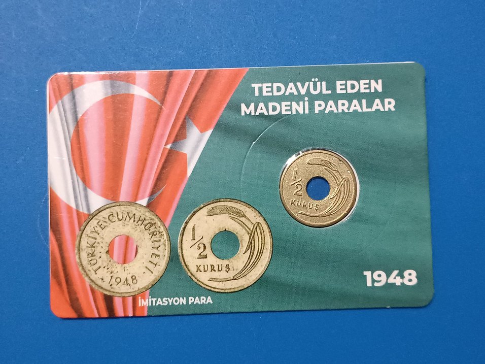 Türk bayrağı fonlu kart üzerinde sergilenen 1/2 kuruş imitasyon madeni para seti. Tedavülde madeni para olarak belirtilmiştir.