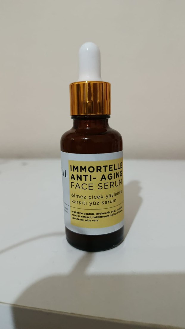 Immortelle anti-aging yüz serumu, peptitler, hyaluronik asit, kolajen ve aloe vera içerir, yaşlanma belirtilerini azaltmaya yardımcı olur.