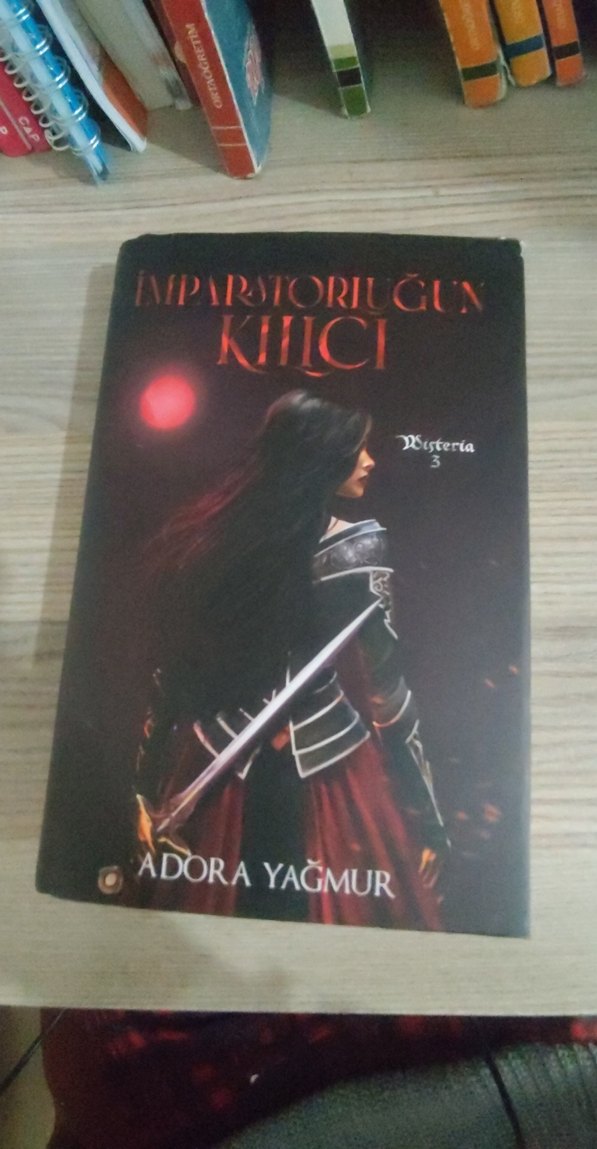 Adora Yağmur'un "İmparatorun Kılıcı" adlı romanı, kılıç tutan savaşçı bir kadını ve kırmızı ayı içeren karanlık bir arka planı gösteriyor. Wisteria serisinin bir parçası. ⚔️