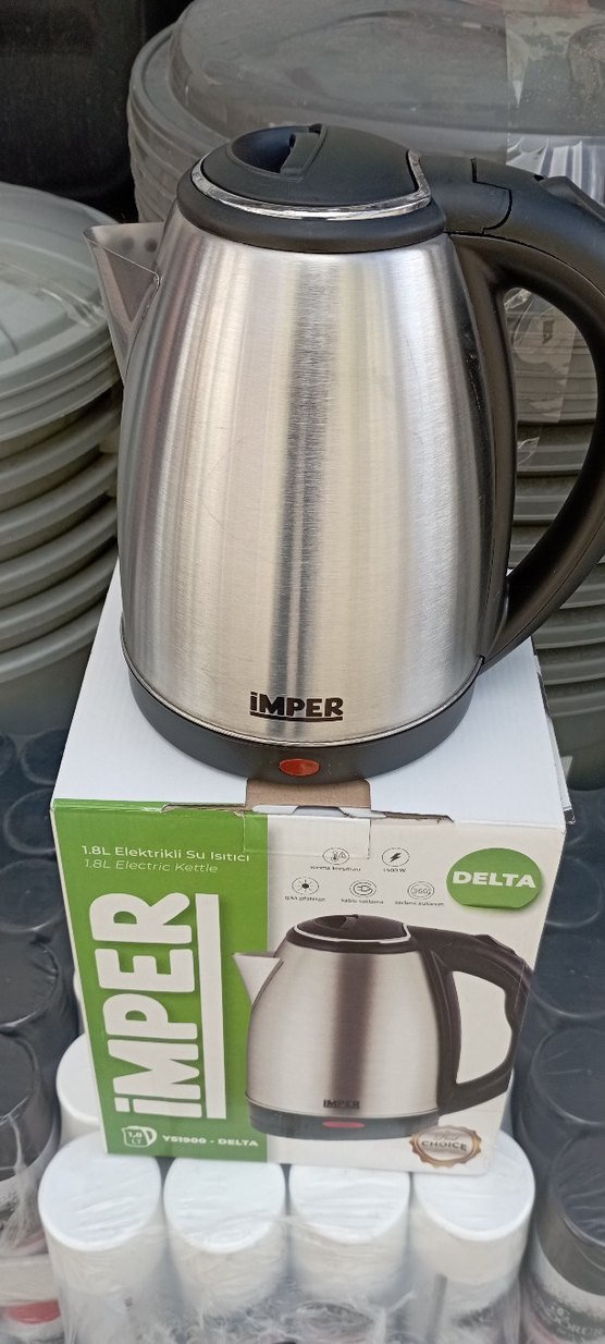 Imper markalı 2 Lt kapasiteli elektrikli su ısıtıcısı, gri-yeşil renkte, dayanıklı paslanmaz çelik gövde ve sağlam tutma sapına sahiptir.