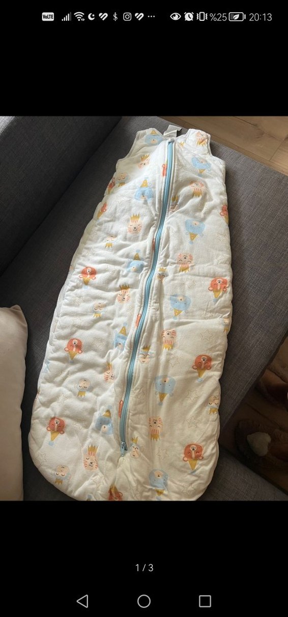 Gri renkte, pastel nakış desenli ve kolay kullanım için ön fermuarlı yumuşak kumaştan bebek uyku tulumu. Yurtdışı ürünüdür