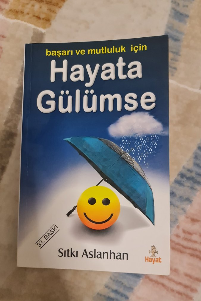 Sıtkı Aslanhan'ın "Hayata Gülümse" kitabı, başarı ve mutluluk için esprili yaklaşımlar sunuyor. Kapakta, yağmurdan koruyan şemsiye altında gülen yüz yer alıyor.