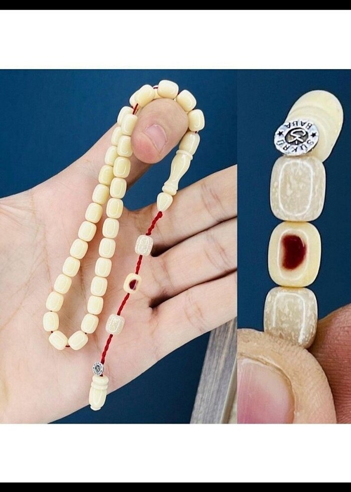 Beyaz renk, yumusak cekim. Cektikce renk degistirir. Orijinal kehribar. Usta imzalı kanayan bağa tesbih.