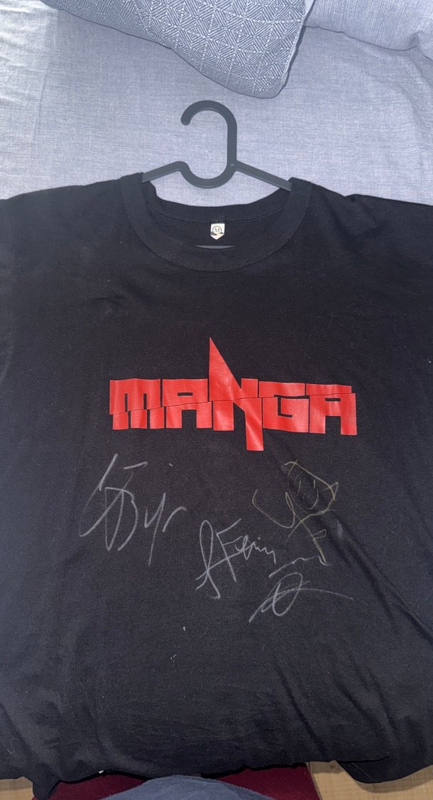 Siyah renkli, maNga üyeleri tarafından imzalanmış oversize tişört