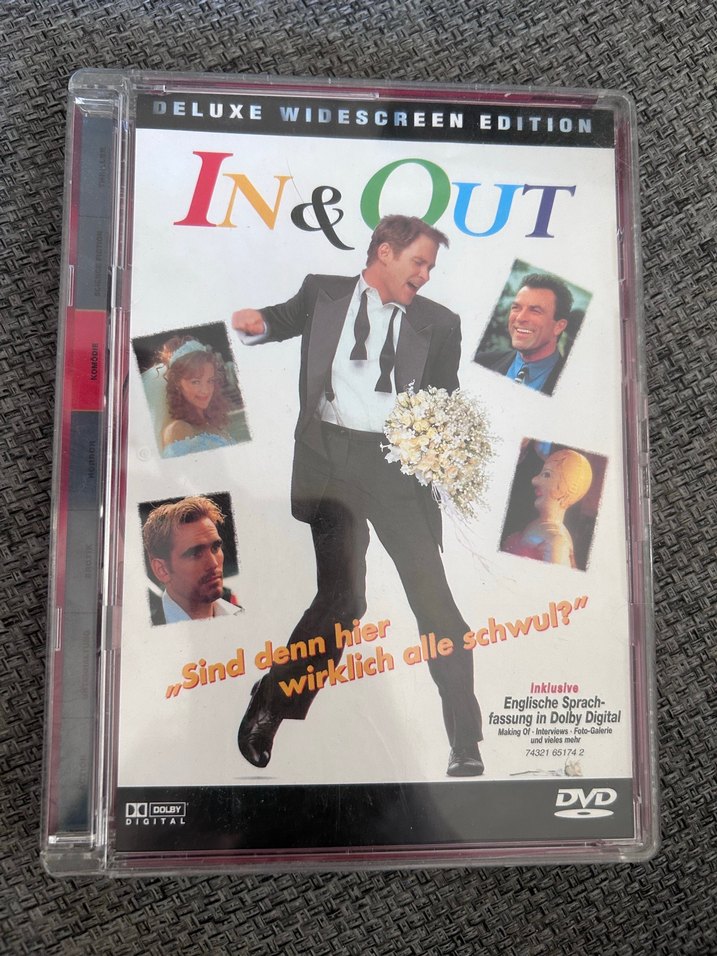 In & Out DVD, İngilizce seslendirme ve Dolby Digital ile deluxe geniş ekran versiyonunda. Komik içerik ve renkli kapak görselleri içerir.