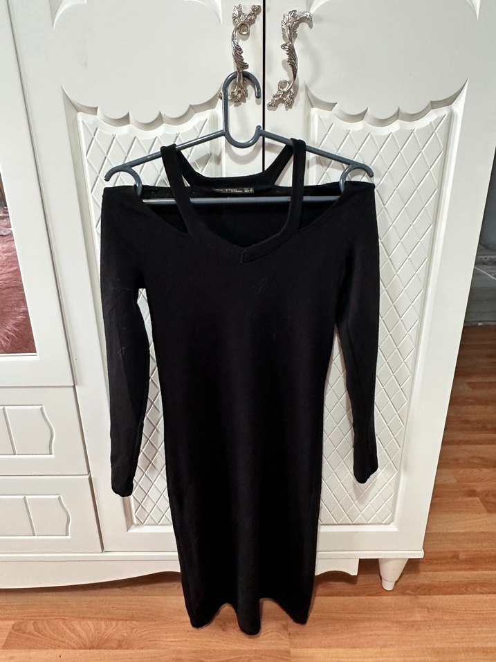 V yaka ve askılı kollara sahip siyah triko elbise, midi boyda ve vücuda oturan kesimdedir. Yumuşak sentetik kumaştan üretilmiş, minimalist gotik tarzda günlük kullanıma uygundur.