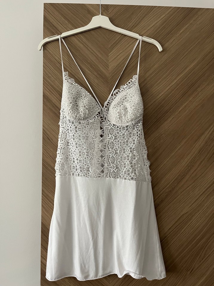 İnce askılı, dantel detaylı beyaz mini gecelik, bohem tarzıyla hafif ve desensiz tasarıma sahip. Küçücük bir lekesi var sanırım dura dura olmuş yıkanırsa geçer hiç kullanılmadı Çeyizden kalma.