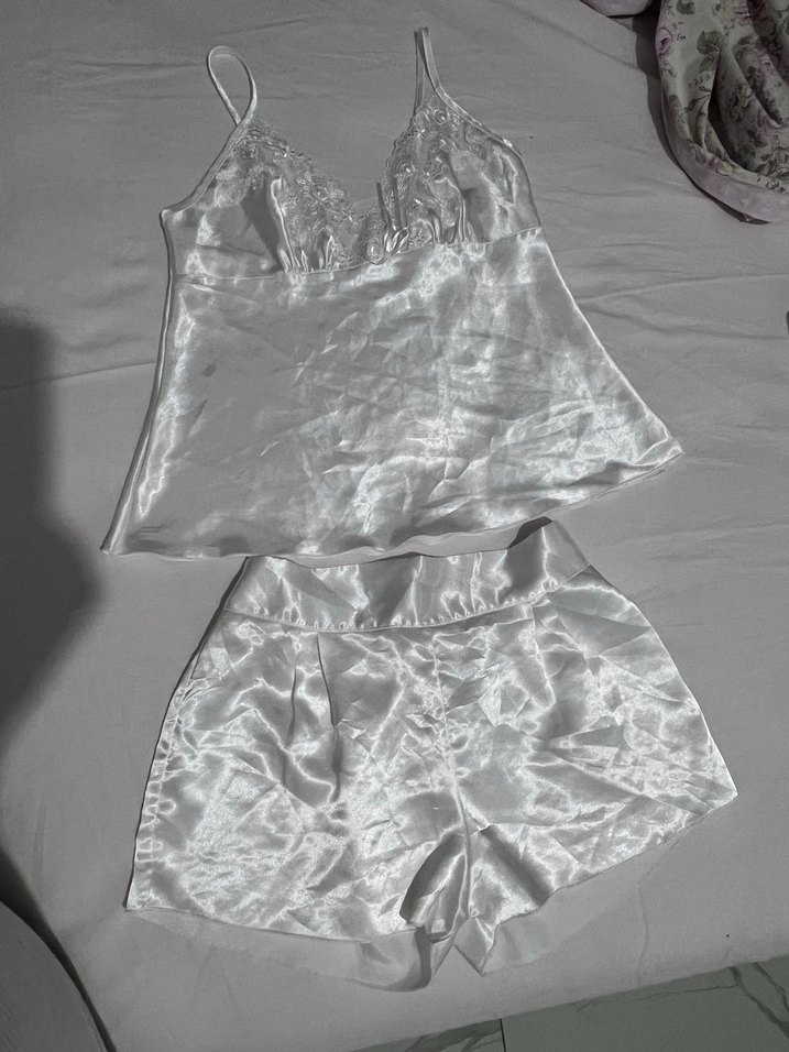 İnce askılı, kısa ve bol kesim beyaz saten pijama takımı, dantel detaylarıyla minimalist ve sokak stili sunar. 4 parça saten hiç kullanılmadı
