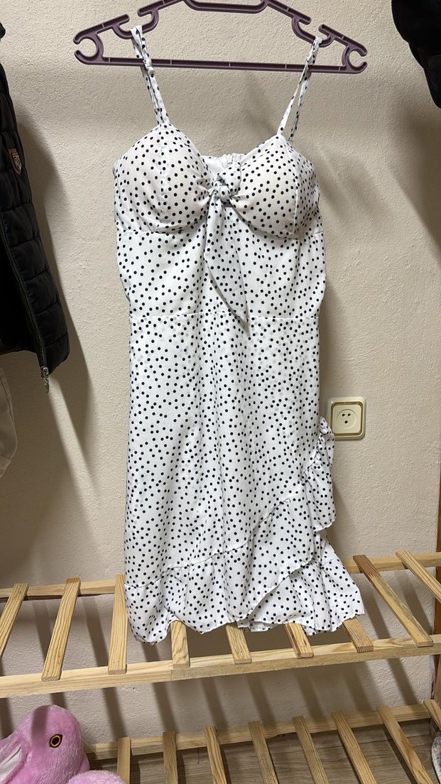 İnce Askılı Beyaz Puantiyeli Uzun Elbise
