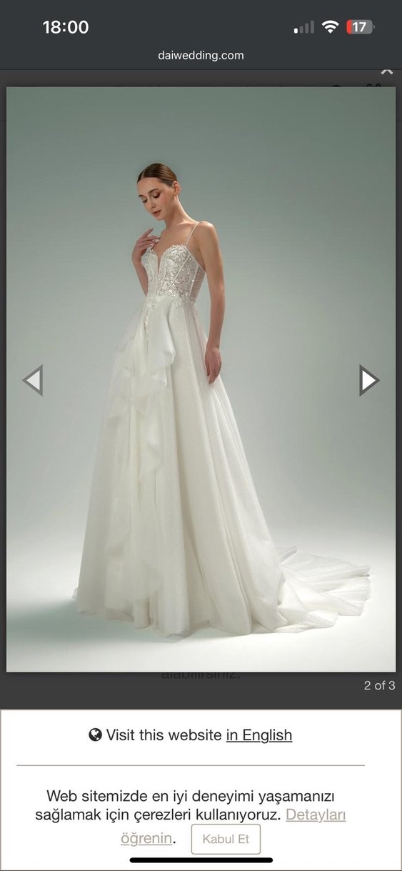 İnce askılı, dantel detaylı beyaz A kesim gelinlik, normal boyda midi uzunlukta, bohem tarzda ve fit kesimlidir. Bel 65 omuz 85 arkadan ipli 15 cm topuklu ile giydim 160 boyum Ankara’da dai wedding mağazasından alındı satılık