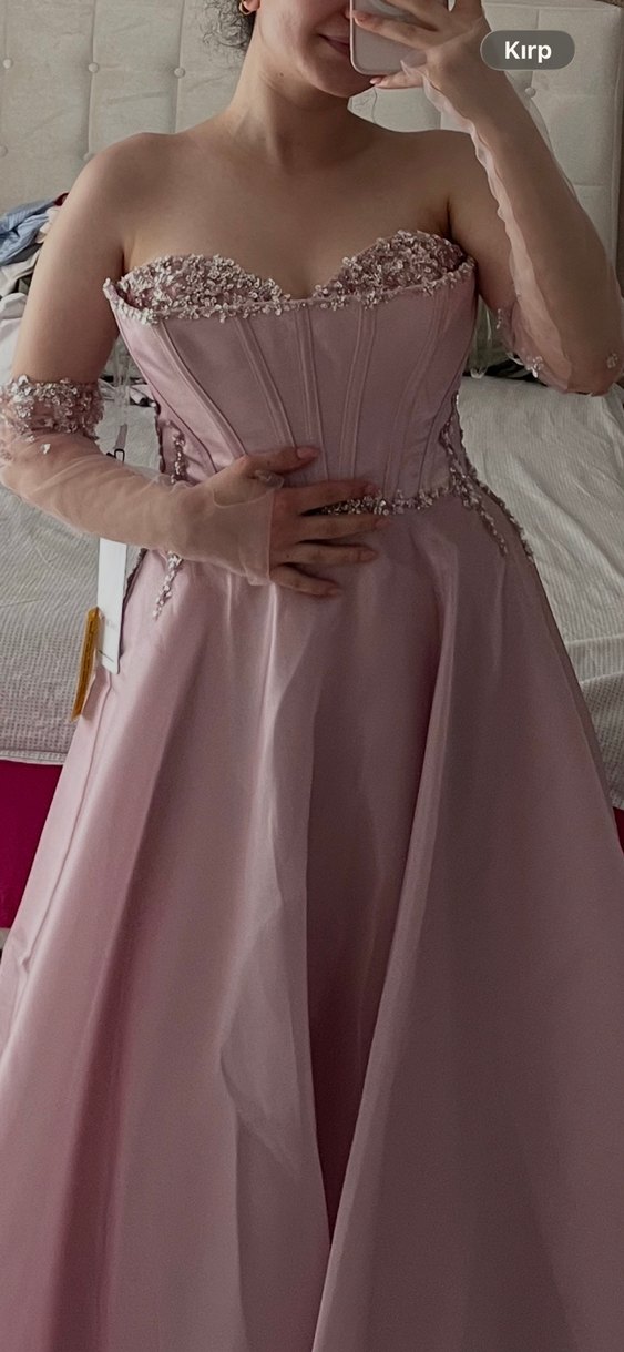 Sadece nişanımda 3-4 saat giydim. Aynı taşlardan ip askı yaptırdım dilerseniz çıkartıp kullanabilirsiniz straplez şeklinde .Tarlatanı hediye olarak yanına koyabilirim. Ben Tarlatanıyla giymiştim elbisenin düz hali son fotoğrafa koydum.36-38 beden için uyumlu. 1.55 boyum 55 kiloda giydim . Etek boyunu hiç kestirmedim sadece içindeki astar topukluya takılıyordu çok az astar kısmı kesildi. 15.000 tl ye almıştım . Detaylı bilgi için yazarsanız yardımcı olurum.