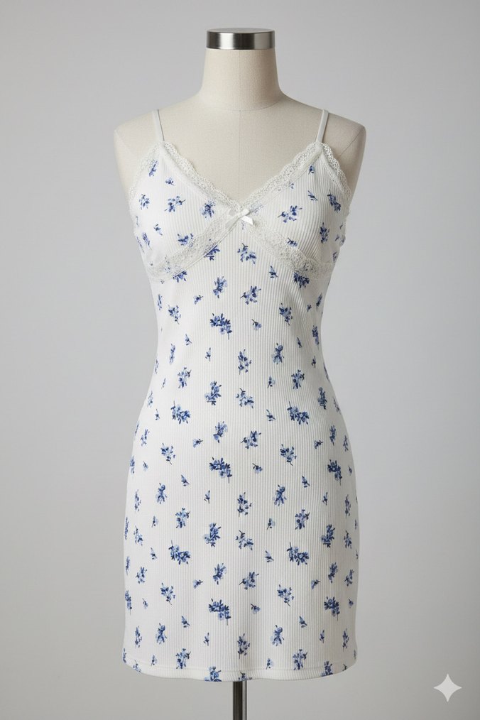 İnce askılı, vücuda oturan mini elbise, beyaz zemin üzerine mavi çiçek desenleri ve dantel detayıyla