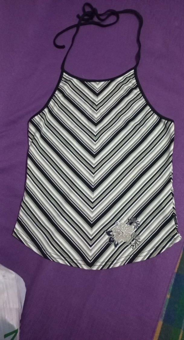 Karanlık mor renkte, ince askılı, çizgili ve dantelli detaylı, sentetik kumaştan yapılmış, vücuda oturan fit kesim üst. Bohem sokak tarzı hissi verir.