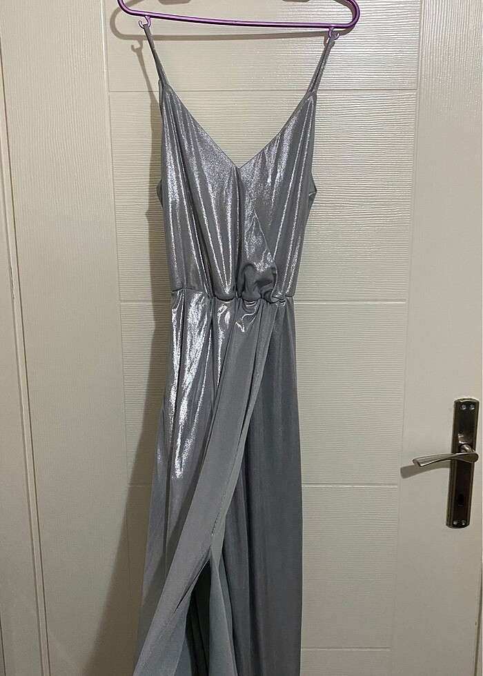 İçi astarlı, ince askılı elbise. Gümüş rengi. #geceelbisesi #abiye #mezuniyetelbisesi #askılıelbise