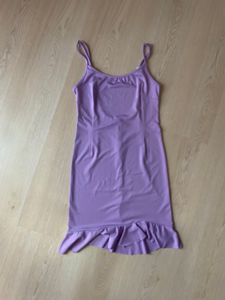 Mor renkli, ince askılı ve midi boyda, vücuda oturan kesime sahip, etek ucu fırfırlı elbise. 1 KEZ GİYDİM