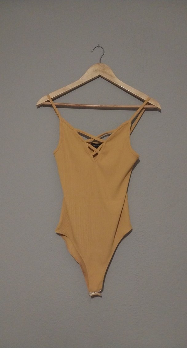 İnce askılı, bej renkli, vücuda oturan kadın body. Minimalist ve desensiz tasarımıyla, günlük kullanıma uygun cesur bir stil sunar.