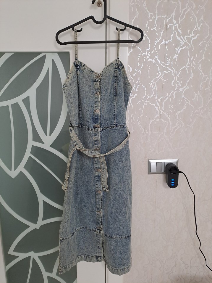 İnce askılı, kemerli ve straplez yaka detaylı, mavi ve gri tonlarında tie-dye desenli, fitted kesim midi denim elbise.