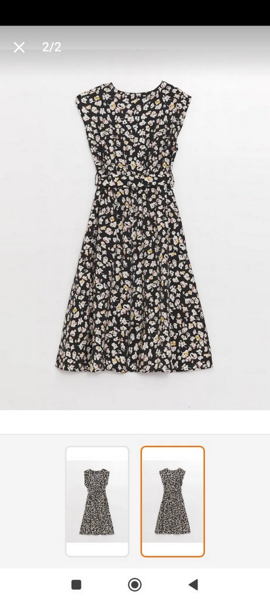 İnce askılı, kemerli midi siyah elbise, bağlama desenli ve bol kesimdir. Yumuşak sentetik kumaştan yapılmıştır, günlük kullanım için uygundur.