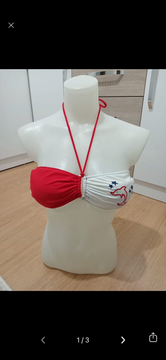 İnce askılı, kırmızı ve beyaz baskılı mini bikini üstü, ayarlanabilir cırt cırtlı kapanışa sahip, plaj için uygun.