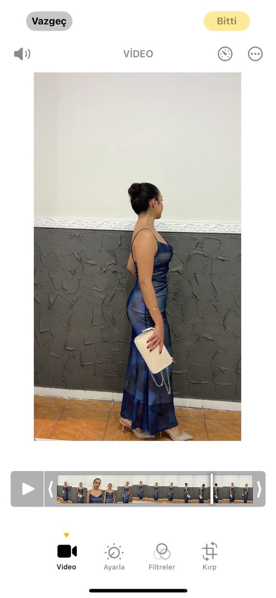Lacivert batik desenli, ince askılı ve drapeli detaylara sahip, uzun ve vücuda oturan denim elbise, romantik akşamlar için uygun.