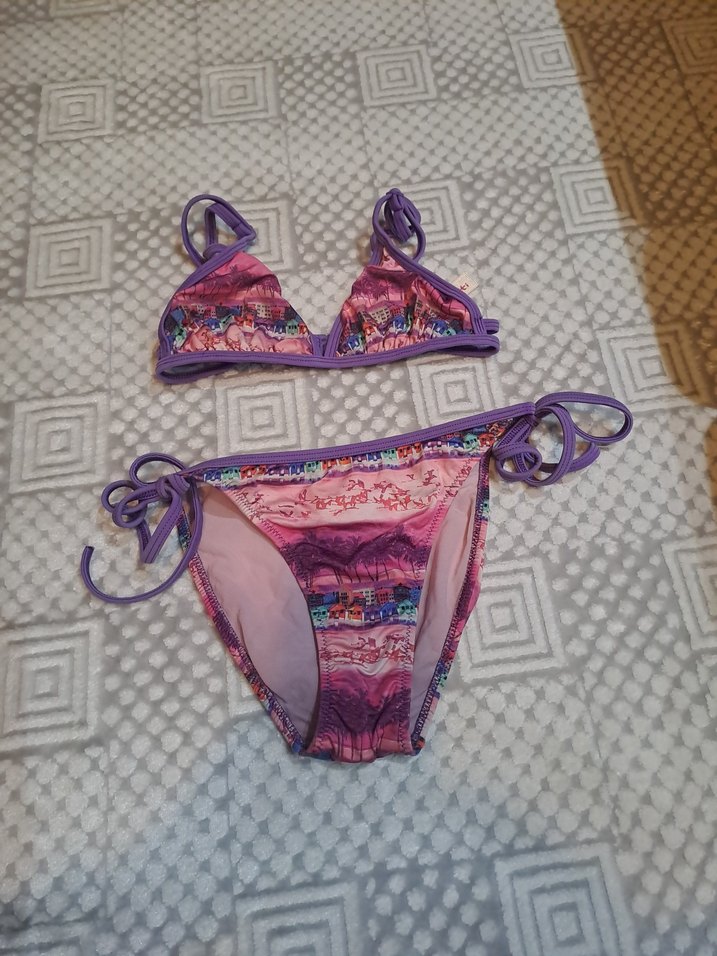İnce askılı, pastel mor batik desenli, dantel detaylı, vücuda oturan bikini. Bohem plaj tarzı için uygun.