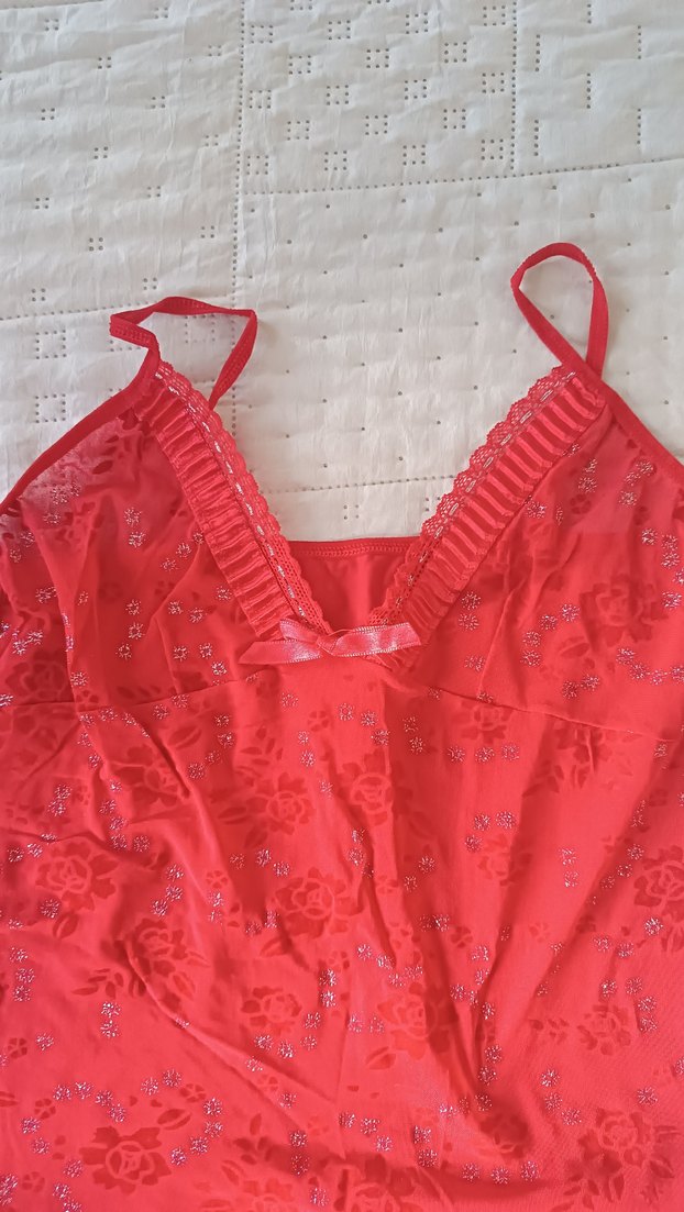 İnce askılı, nakış detaylı kırmızı midi gecelik,aklet vintage bohem tarzını yansıtan parlak bir görünüme sahip.L,,,,xLdiye gecer