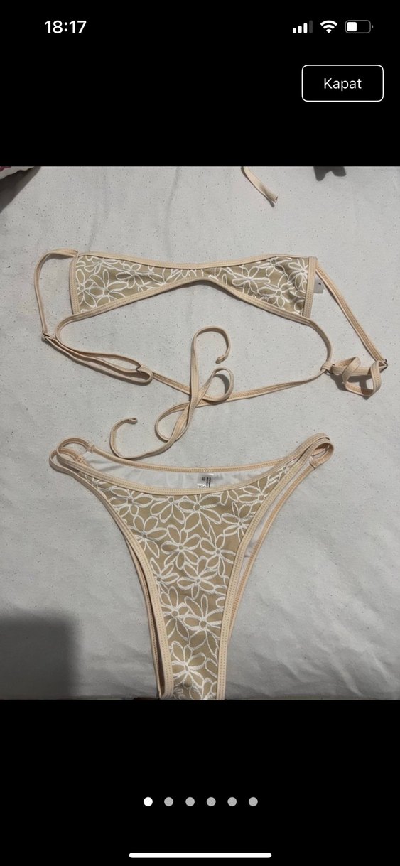 İnce askılı, nakışlı dantel detaylı bej bikini, sıkı oturan ve minimalist bohem tarzıyla plaj için uygundur. üstü küçük altı m l beden küçük göğüs için uygun
