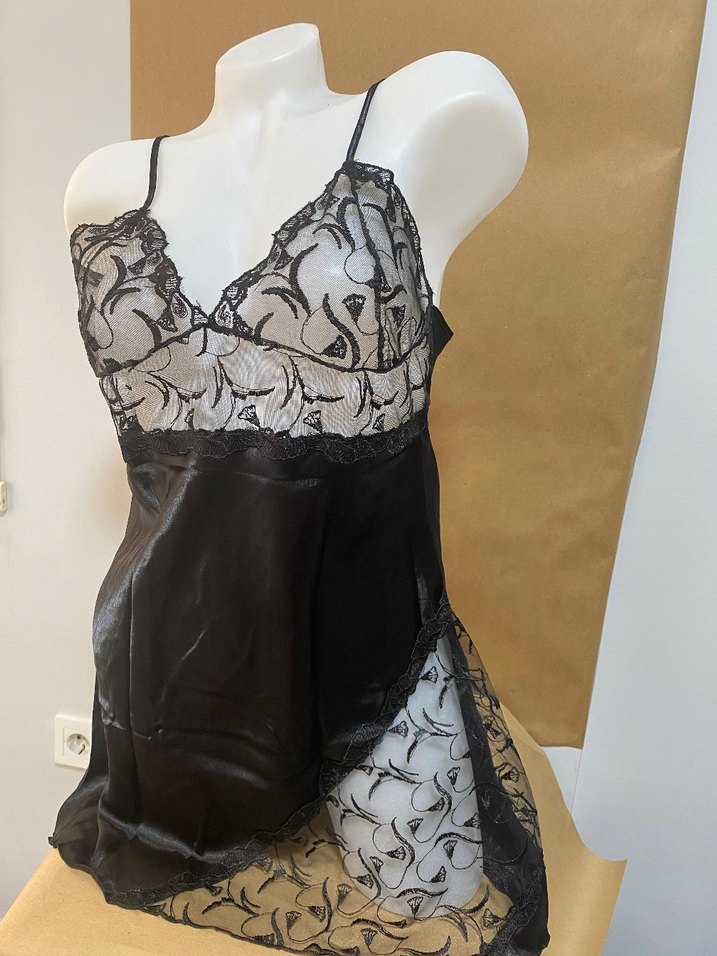 İnce askılı, nakış işlemeli siyah mini gecelik, gotik tarzı zarif detaylarla buluşturuyor. Şeffaf ve düz kumaşlar şık bir görünüm sağlıyor. Bedenleri mevcuttur.