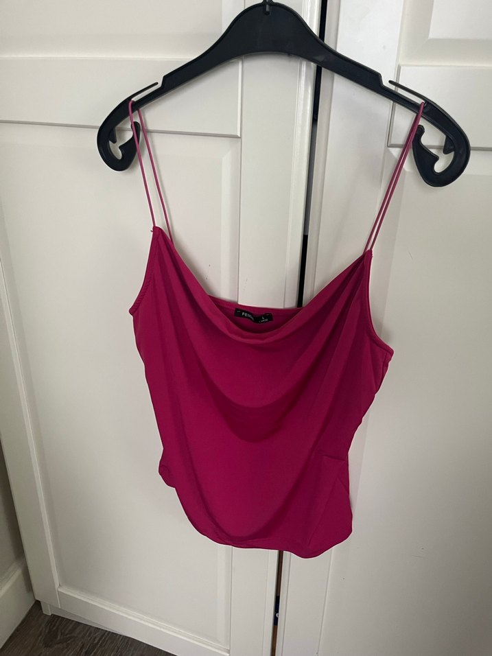 İnce askılı, straplez yaka ve drapeli ve çift katlı ön kısmı ile pembe mini bluz.