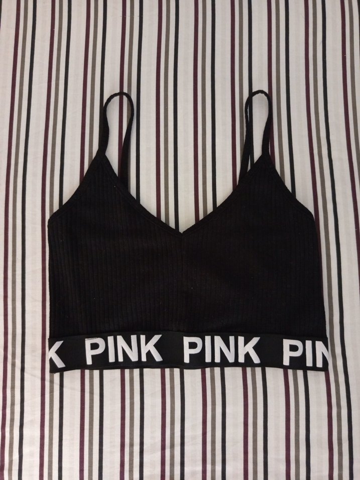 İnce askılı siyah bralet, 'PINK' yazılı elastik bant ile kısa ve rock punk tarzında, rahat kumaştan üretilmiştir.