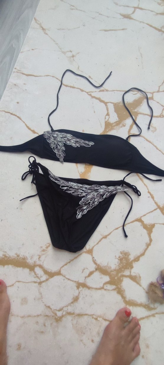 İnce askılı, siyah dantel nakışlı ve mini uzunlukta, bohem ve gotik tarzı yansıtan fit kesim bikini.