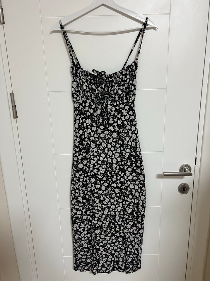 İnce askılı, straplez yaka ve dantel detaylı siyah midi elbise. Çiçekli batik deseniyle romantik akşamlar için uygun. Hiç kullanmadım yıkamak için etiketini söktüm