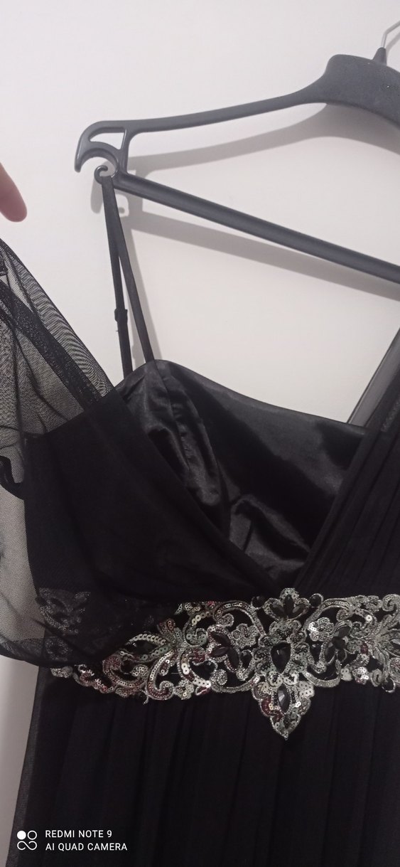 İnce askılı, uzun siyah abiye elbise, tekne yaka ve işlemeli detaylarla drapeli, gotik tarzda parti kıyafeti için uygundur.