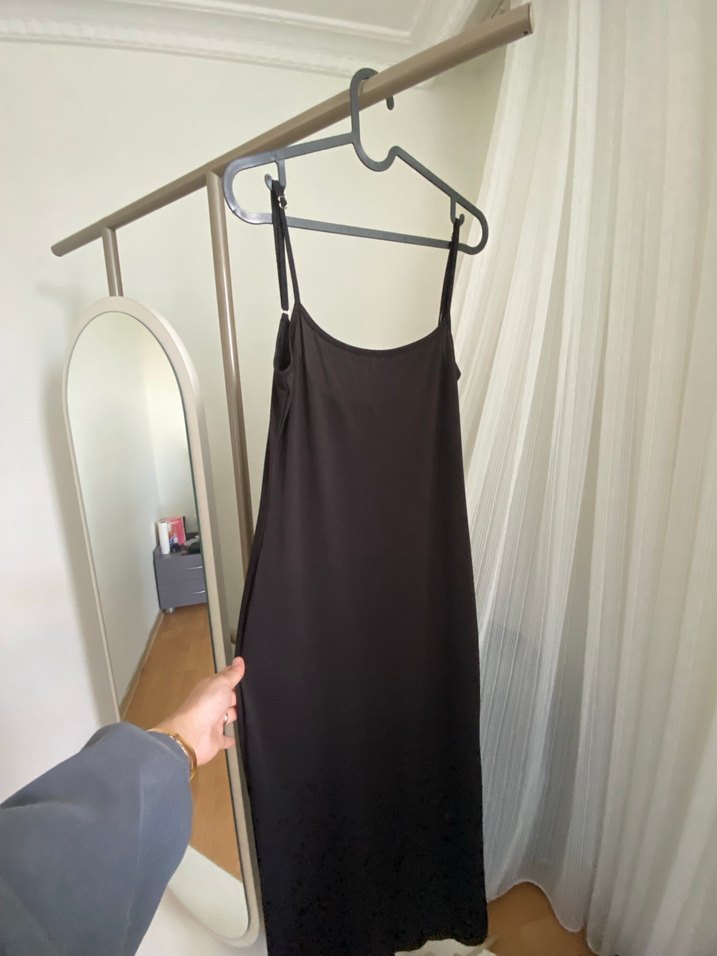 Siyah, ince askılı, uzun ve vücuda oturan, saten dokulu kumaştan yapılmış, yan yırtmaçlı kadın elbisesi.